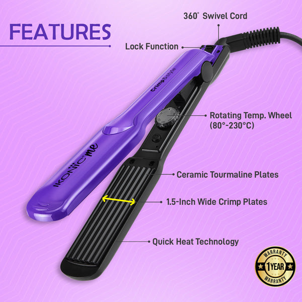 Ikonic Me Crimp and Style features wide ceramic tourmaline plates for even heat distribution and maximum heat retention, ensuring a perfectly defined, long-lasting texture for your hair. With dual voltage technology, it’s universally compatible. The PTC heater enables ultra-fast heat up for quick styling, while the crimper’s lock function ensures compact and damage-free storage. The swivel cord ensures safety and tangle-free use. Its sleek, ergonomic, and tapering design not only makes it stylish but also comfortable to hold. Achieve flawless hair every time with Crimp and Style.