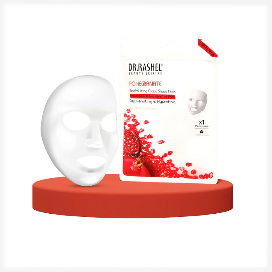 Pomogranate Sheet Mask which rejuvinates & hydrates the skin, moisturize & brightens the skin. This revitalizing facial sheet mask is suitable for all skiin types. Dr.Rashel’s brightening and illuminating sheet mask infused with Pomegranate Extract, Antioxidants such as the Vitamin C found in Pomegranate work by reducing cellular damage in your body, Reduced free radical damage can also translate the decreased inflammation in the skin.
